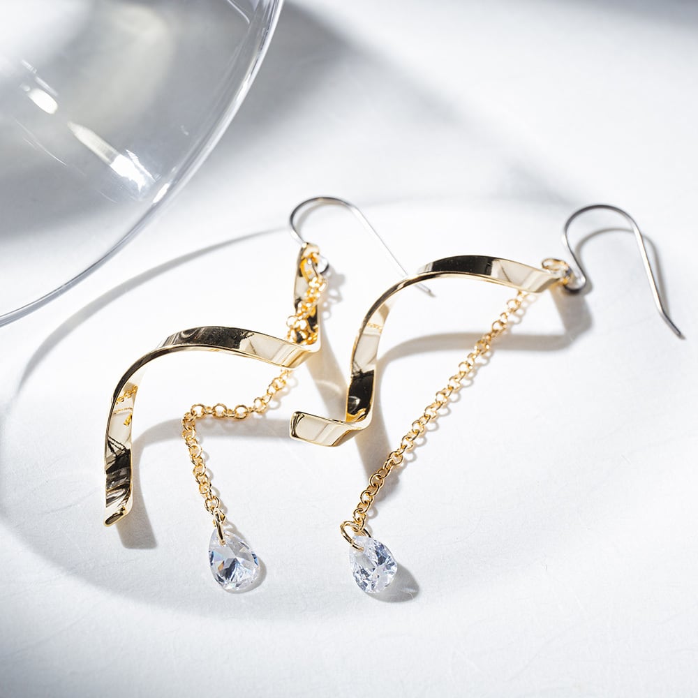 滑らかにカーブするゴールドパーツに流星のように落ちる星屑を思わせるデザインのシンプルかつ上品なアイテム。螺旋の内側で揺れる輝くビジューが目を惹き、美しく可憐な印象を演出してくれます。シンプルなデザインですが程よい存在感があり、お呼ばれや普段使い等どんなシーンにも活躍してくれそうなアイテムです。